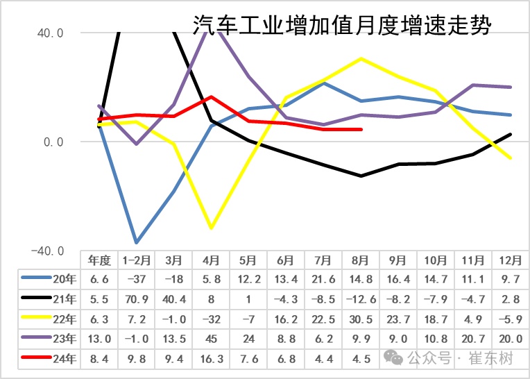 2020年汽车工业增加值增6.6%,2021年增速徘徊在5.5%的水平,2022年的汽车增加值6.3%,较强。2023年汽车业增加值增13%,实现超强增长。2024年1-8月的8.4%的汽车增加值相对提升较好,但8月的4.5%偏弱。