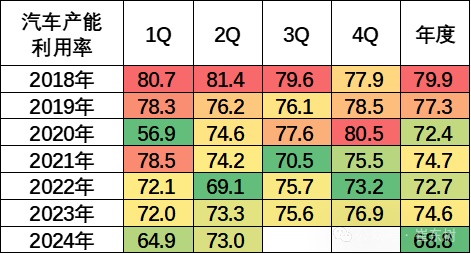 汽车制造业2024年2季度73%,比上年同期下降0.3个百分点,比上季度增长8个百分点。2024年上半年汽车行业产能利用率仅有68.8%,较同期下降3.9个百分点,汽车产能利用率偏低。