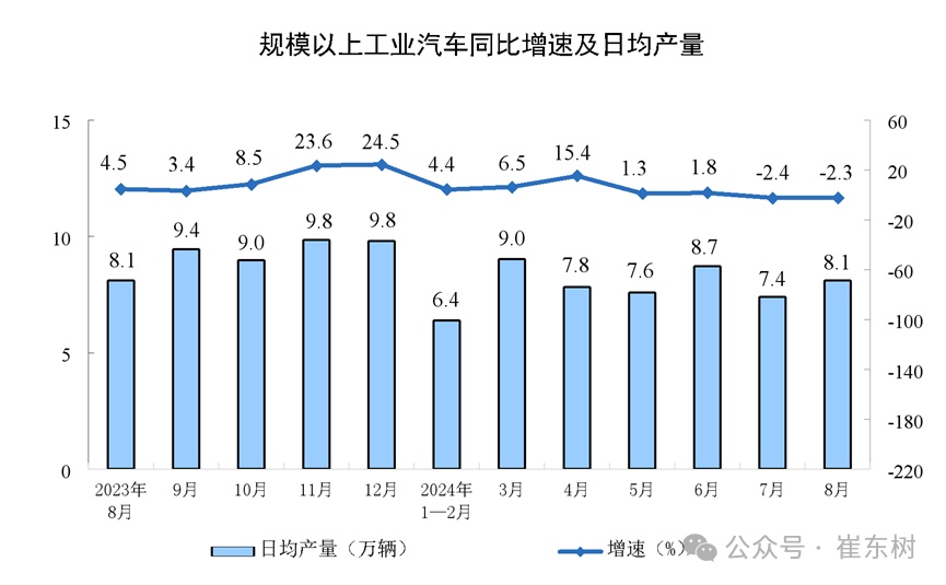 分产品看, 2024年8月份,汽车日均8.1万辆,降2.3%,考虑到2023年8月低基数,今年增速的表现是一般。