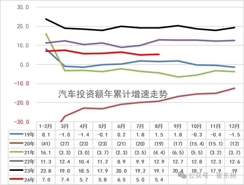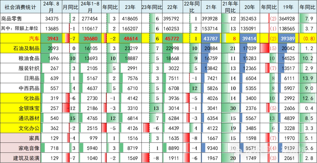 目前看消费不旺的问题稍有改善,2024年1-8月汽车消费出现负增长,没有跟上商品零售的平均增速,未来高基数的增长压力仍较大。