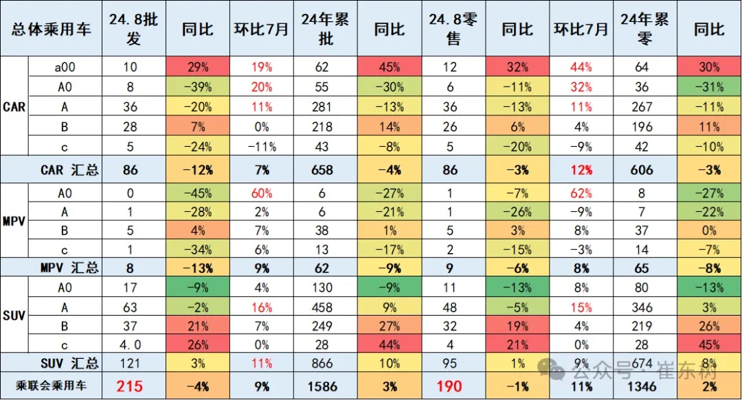 智通财经APP获悉,乘联分会秘书长崔东树发布8月乘用车细分市场车型走势。随着2-4月的市场价格降价和促销力度大,消费者观望一段时间后,购买热情逐步释放,在国家报废更新补贴政策的推动下,2024年8月乘用车市场零售表现较好。8月的厂家销量相对保守,形成大幅去库存的特征。
