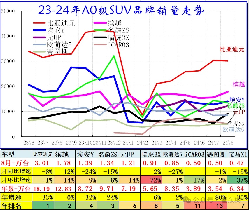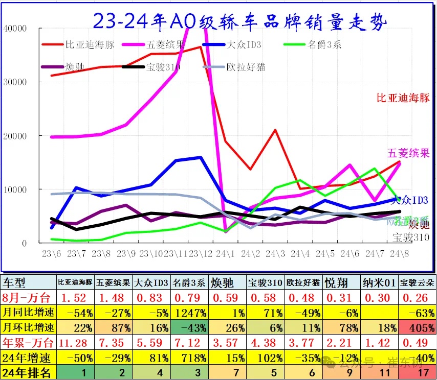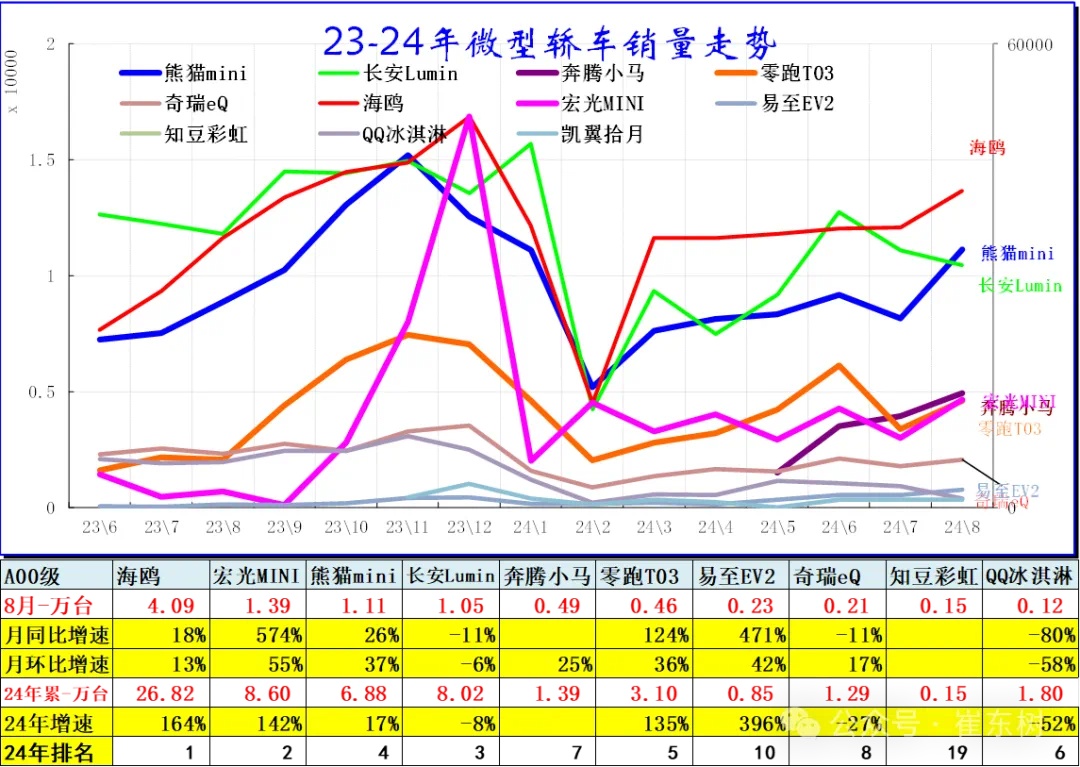 A0级轿车的全面电动化趋势明显,基本没有太强的燃油车产品,体现了自主的纯电动的产品优势明显。