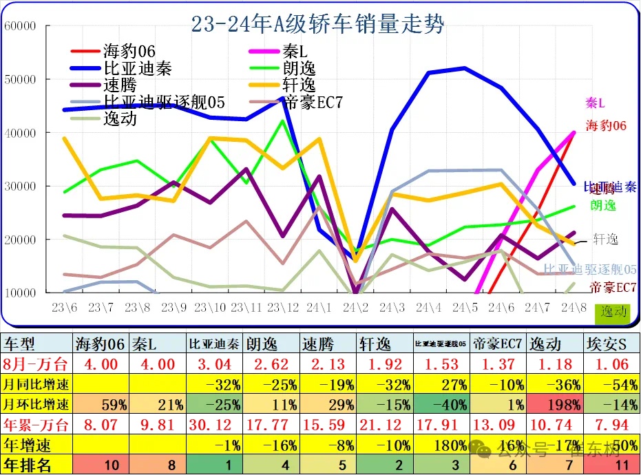 A00级轿车2024年8月批发9.65万台,占批发份额11.21%,批发较去年同期同比增长29%,批发环比今年上月增长19%;2024年8月零售较去年同期同比增长32%,零售环比今年上月增长44%。2024年1-8月批发数量62.21万台,厂家批发销售累计增幅45%;2024年1-8月国内零售数量64.33万台,零售累计增幅30%。