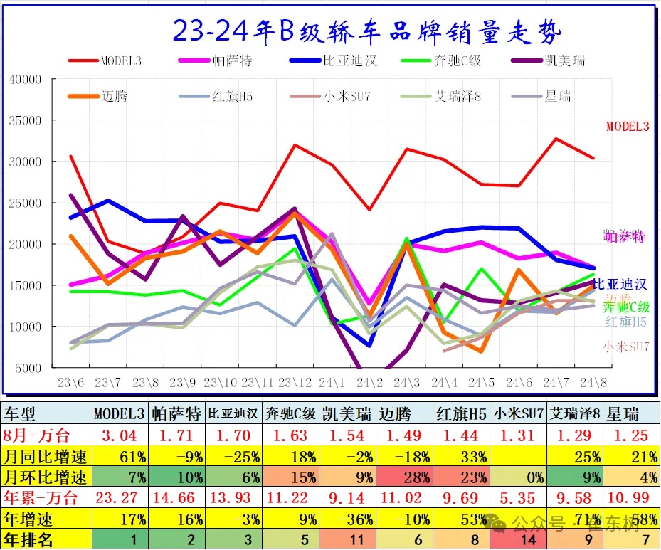 主流轿车市场的新能源占据主导地位,其中比亚迪绝对领先,而大众的燃油车仍有一定的市场空间,主流家用车仍是燃油车最实用。