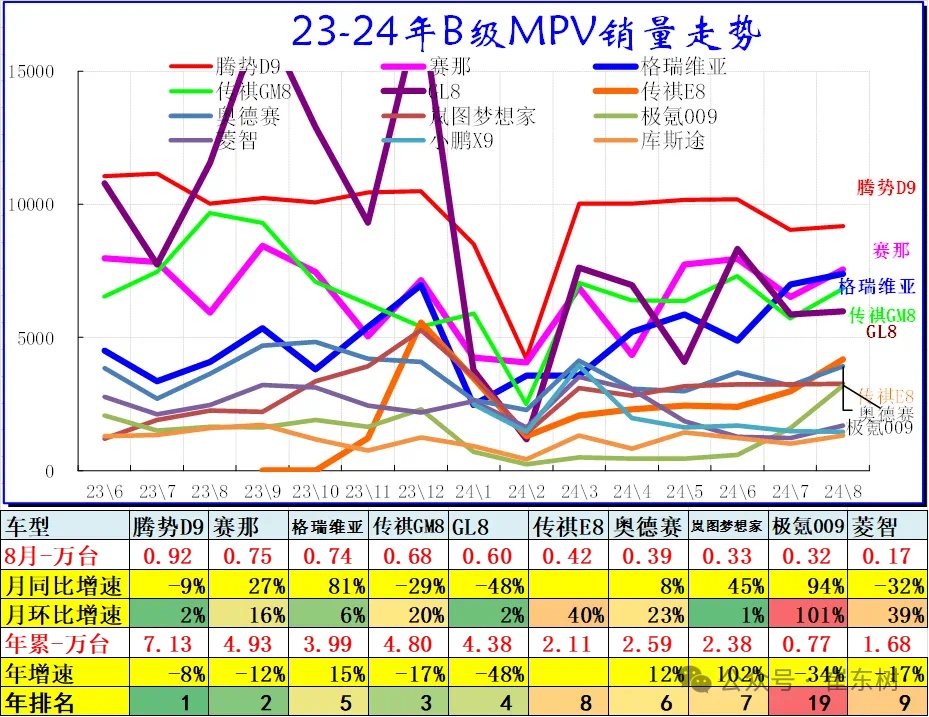 MPV市场的高增长阶段已经改为低增长趋势。腾势和传祺的MPVC表现超强,日系的MPV优势迅速下降,GL8也处于调整期。