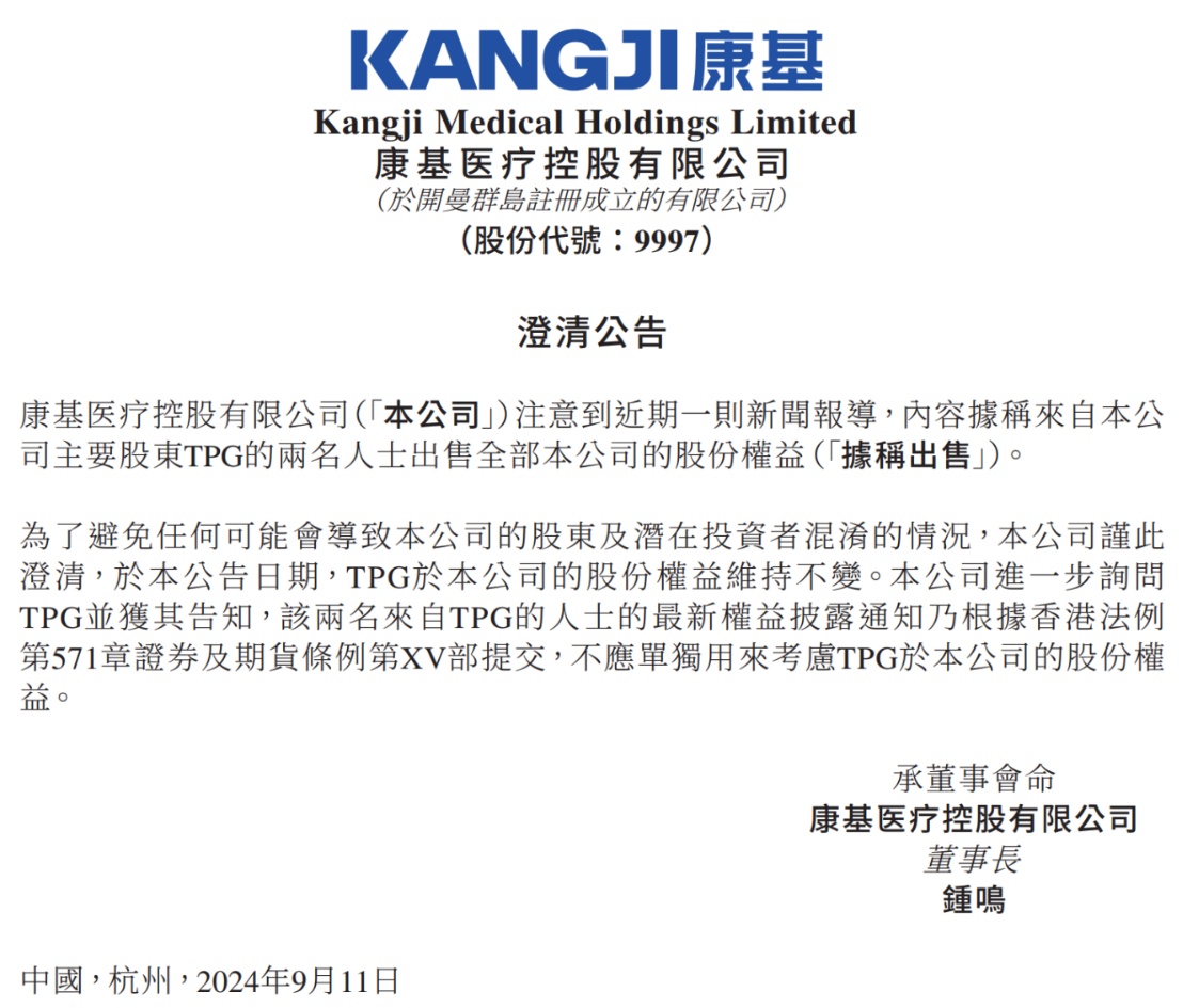 步入9月,康基医疗(09997)在二级市场突遭“六连跌”。公司股价由8月30日收盘价5.79港元,经过6个交易日连跌后,在9月11日盘中触底4.91港元,回吐了自今年2月中旬以来的全部涨幅。当日夜间,康基医疗紧急发布了一则澄清公告,表示“于本公告日期,TPG于公司的股份权益维持不变。”
