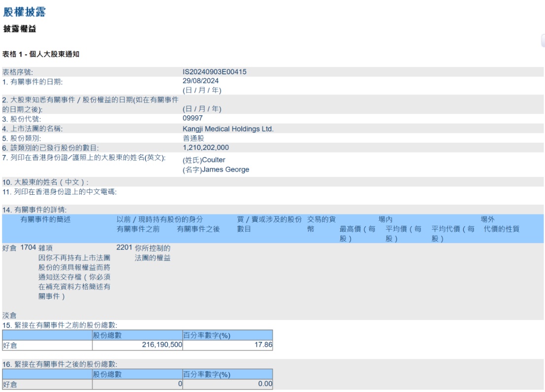 此次康基医疗出现市场舆情波动原因在于,市场有消息称在港股披露易官网查询到TPG作为康基医疗主要股东“出售”了其持有的康基医疗全部股份(见下图)。