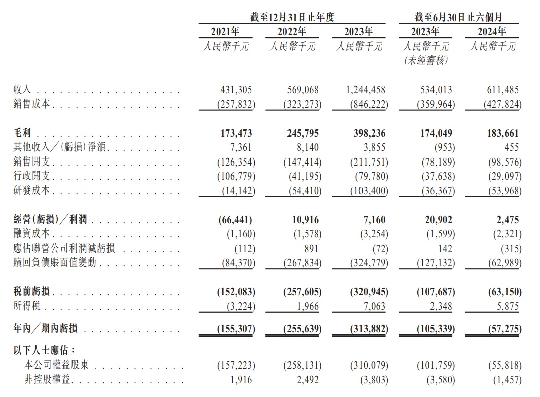 财务方面,于2021年度、2022年度、2023年度及2024年截至6月30日止六个月,该公司的收入分别约为人民币约4.31亿元、5.69亿元、12.44亿元及6.11亿元。同期,该公司年内亏损分别约为人民币1.55亿元、2.56亿元、3.14亿元及5727.5万元。