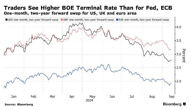 英国央行在8月确实发出了进一步降息的信号,当时该央行宣布了四年多来的首次降息,降至5%,但坚称不会急于降息,因为没有任何经济衰退或失业率飙升的威胁。