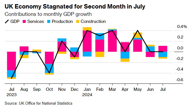 上周公布的国内生产总值(GDP)数据可能支持这一观点。数据显示,7月经济停滞不前,这意味着在过去四个月的数据中,英国有三个月没有增长。