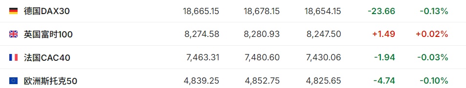 2. 截至发稿,德国DAX指数跌0.13%,英国富时100指数涨0.02%,法国CAC40指数跌0.03%,欧洲斯托克50指数跌0.10%。