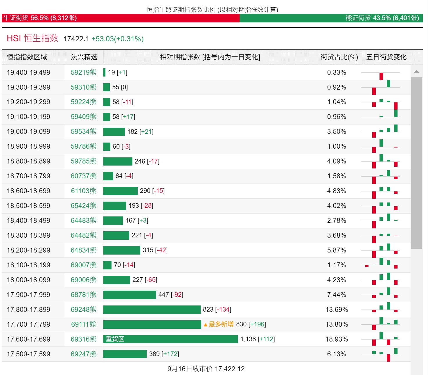 智通财经APP获悉,截至9月17日,恒指最新的牛熊街货比例为56.5:43.5。