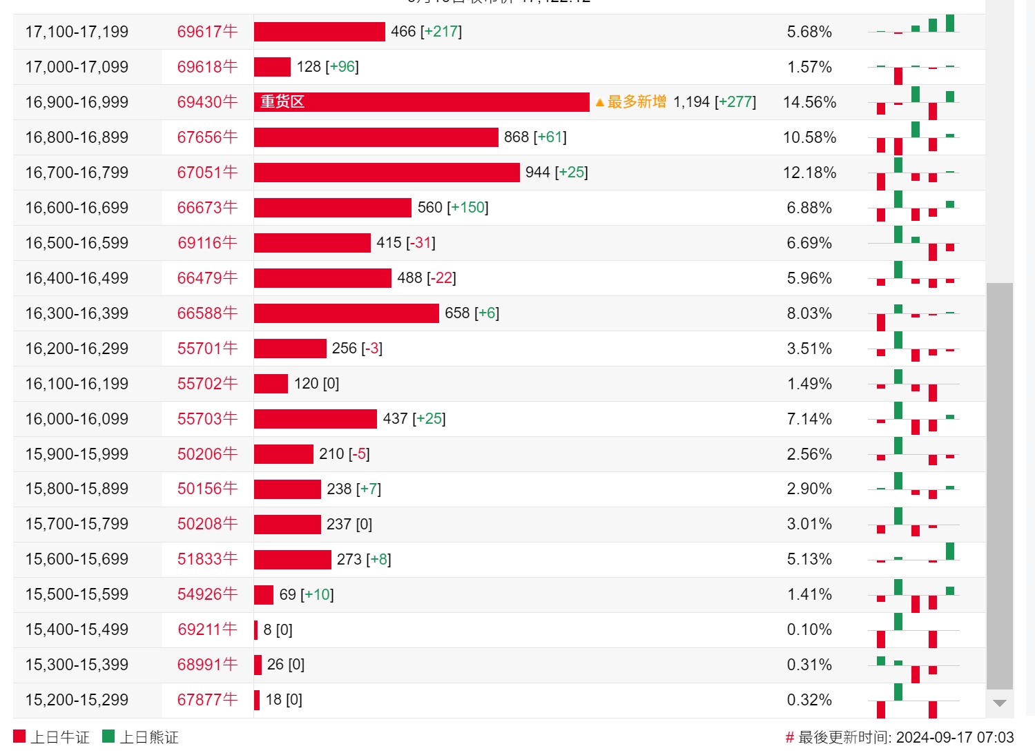 牛证街货重货区和最多新增均在16900-16999区间,该区间最新牛证数量为1194张,较上一交易日增加277张。