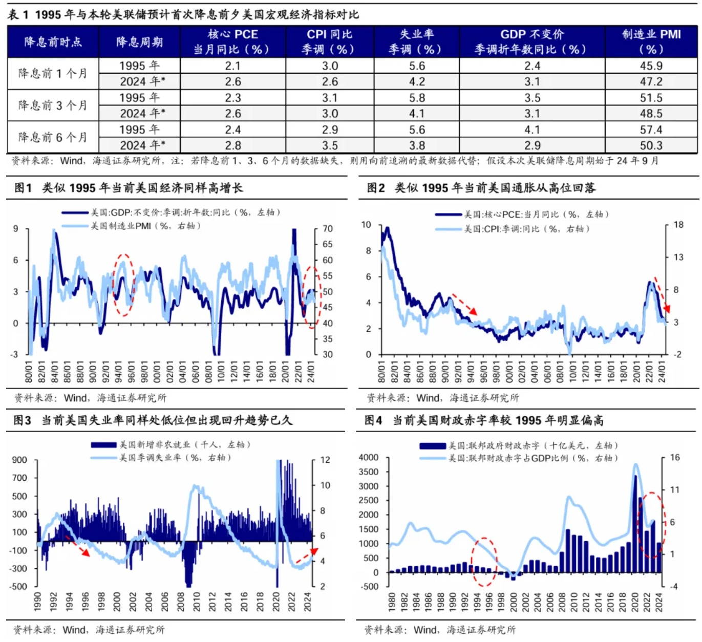 美国经济:当前整体环境类似1995年,但这次失业率回升已久且赤字率高。复盘1982年历次美联储开启降息前美国主要宏观经济指标的表现,可以发现美国当前宏观环境类似1995年,呈现高增长、通胀高位回落、低失业率的格局。经济增长方面,上世纪90年代与现在同样高增长,政策刺激与科技周期共振下1995年降息前两个季度美国GDP不变价同比分别为2.4%、3.5%,这次GDP增速高达3.1%;通胀方面,1995年与当前通胀均在缓解,90年代初石油危机后CPI季调同比从1990/10的高点6.4%回落至降息前的3.0%,当前通胀也从2022/09的9%降至2024/08的2.6%;就业方面,90年代与目前失业率均较低,美国劳动供需平衡背景下90年代失业率不断下行,1995年降息前失业率降至5.6%,而目前最新8月失业率仅为4.2%。