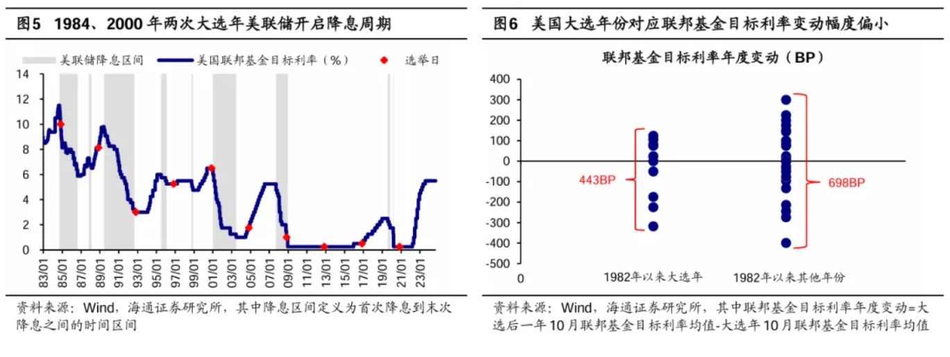 美国政治:本次降息恰逢大选年,大选年美联储仍可能降息但操作更谨慎。历史上美联储在美国大选年降息的情况并不常见,从历史经验看,大选年并不妨碍美联储开展降息。回顾1982年以来的10次大选,美联储曾在1984年、2000年两次大选前后开启降息,其中1984年首次降息发生在大选投票日前两个月,而2001年首次降息则发生在投票日后两个月。由此可见,大选年并不妨碍美联储进行必要的降息操作,衰退式降息与纾困式降息均有可能发生;美联储降息的具体时点并不确定,可能在大选日前、也可能在大选结束后。除此之外,大选年美联储操作通常会更偏谨慎。统计美国总统大选结束后一年内美联储利率的变动情况,考虑到美国大选通常在11月举行,我们通过计算大选结束后一年10月与大选年10月联邦基金目标利率均值之差来衡量美联储操作变动。统计结果显示,自1982年以来,美国大选年后一年内联邦基金利率的变动范围比其他年份更窄,变动幅度也较小,这表明美联储在大选年的操作可能更加谨慎。