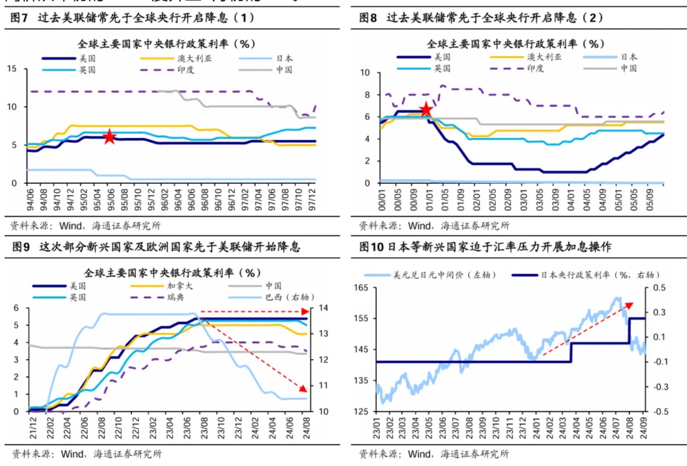 海外货币政策:本次美联储降息时点偏晚,全球央行政策协调性有所下降。回顾历史,过去美联储通常领先全球央行开启降息周期,例如在1995年-1996年全球央行降息周期内,日本央行、美联储率先降息,随后英国、中国、澳大利亚、印度等国家央行陆续跟进;再比如2001-2003年的全球央行降息周期也是由美联储开启,逐步传导至日本、澳大利亚、英国、印度等其他央行。然而这次全球央行政策协调性有所下降:一方面,部分新兴国家与欧洲国家在经济重压下先行开启降息,中国(2021/12)、智利(2023/07)、巴西(2023/09)率先降息,今年以来瑞士(2024/03)、瑞典(2024/05)、加拿大/欧元区(2024/06)、英国/新西兰(2024/08)央行也陆续降息,而美联储这次的降息启动时点较晚;另一方面,日本、印尼等国家迫于汇率贬值压力进行加息,具体来说,日本央行于2024/03宣布退出负利率、并于2024/07再次加息,主要为应对2024年以来日元的加速贬值,今年美元兑日元中间价从年初的143一度升至7月初的162。