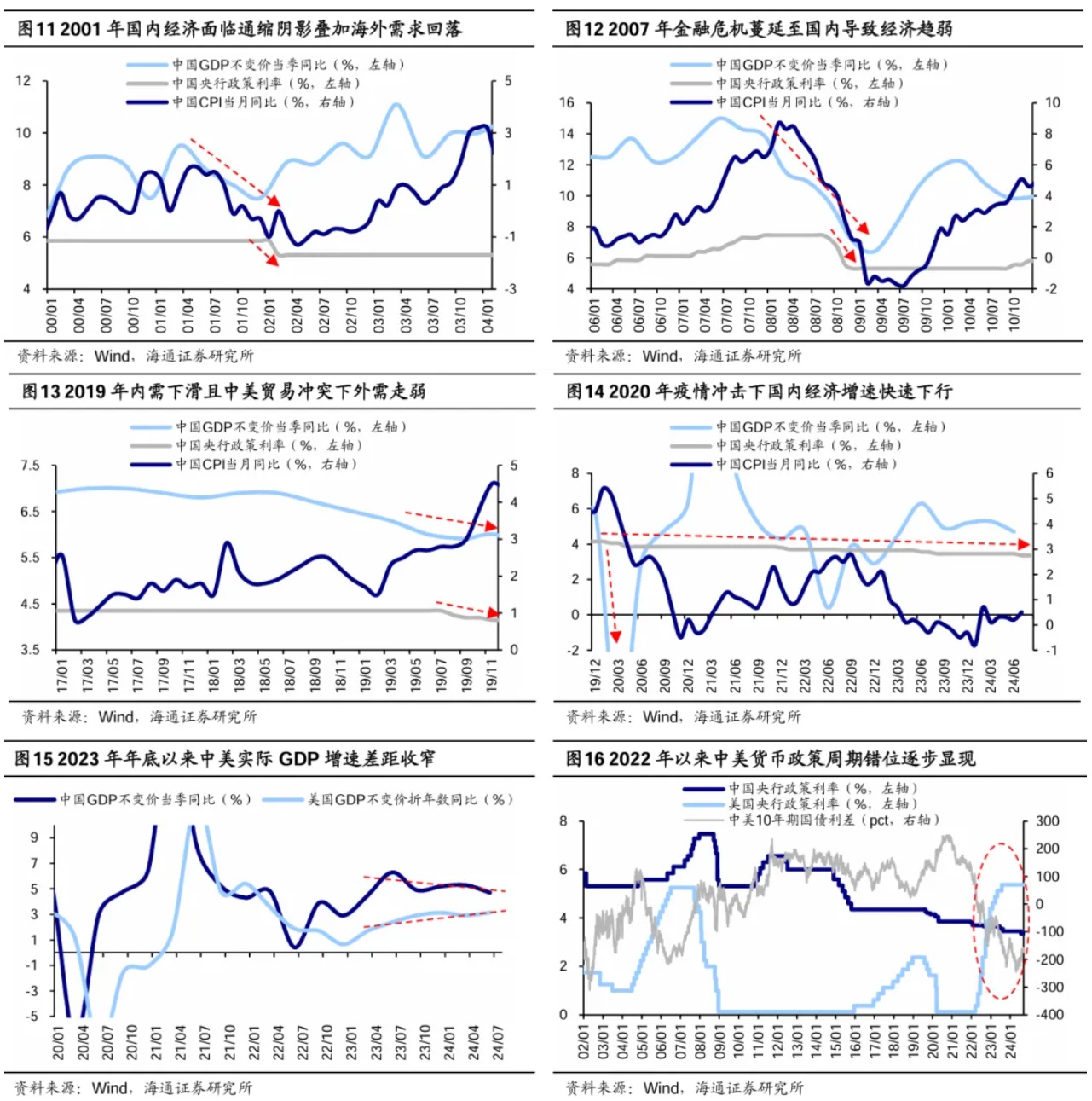 历次美联储降息时中美经济与货币政策周期较为一致,但这次出现错位。回顾历史,美联储降息前中国经济通常偏弱,降息落地后中国央行往往跟随降息。一般而言,美联储降息对应美国经济衰退/增长边际放缓,即美国经济大体有所走弱。实际上,历次美联储降息前夕中国经济同样疲软,背后是国内经济增长面临内忧外患,例如2001年国内通缩阴影叠加海外科网泡沫冲击,2007年金融危机蔓延至国内,2019年内需回落叠加中美贸易摩擦下出口走弱,2020年全球新冠疫情冲击。由于美联储降息时国内经济整体偏弱,为促进国内经济复苏、同时平衡国际资本流动,美联储首次降息落地后中国央行通常跟随降息,比如2001/01、2007/09、2019/08、2020/03美联储首次降息后,我国央行分别于2002/02、2008/09、2019/08、2020/03首次跟随降息。