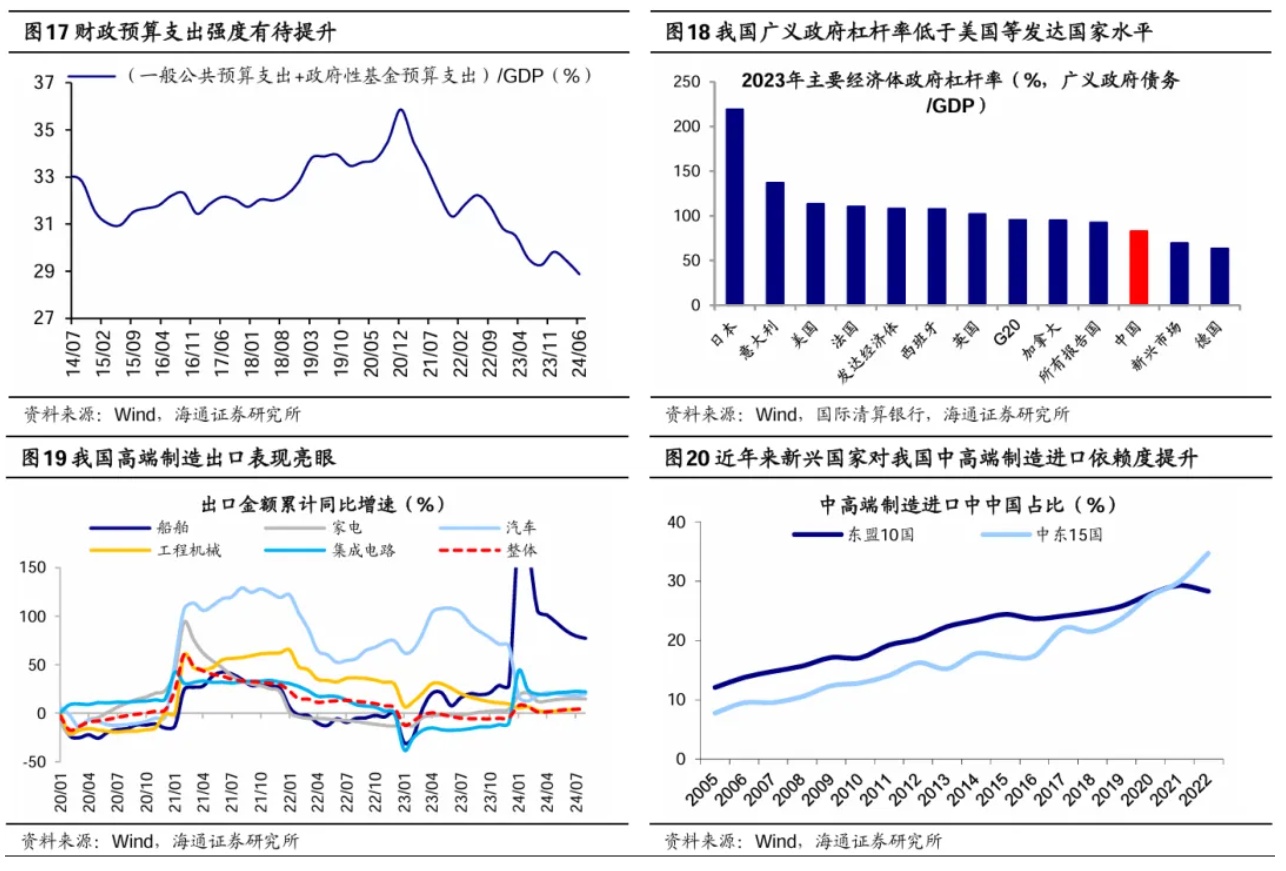 一是监管层释放稳增长信号,财政有望发力提振内需。近期监管层的发言和出台的一系列政策显示稳增长正在发力,例如9月12日习近平总书记在甘肃省兰州市发言强调“抓好三季度末和四季度经济工作,努力完成全年经济社会发展目标任务”;9月14日国家金融监督管理总局发布《关于促进非银行金融机构支持大规模设备更新和消费品以旧换新行动的通知》,鼓励非银机构支持大规模设备更新和消费品以旧换新行动。此外,730政治局会议提出“宏观政策要持续用力、更加给力”,财政政策已在逐步发力,9月14日财政部宣布拟发行2024年第六期超长期特别国债。若我们以两本账的支出占GDP的比重衡量财政强度,2023年、2024年上半年分别为29.8%、28.9%,明显不如2018-2020年水平。根据国际清算银行统计,23年我国广义政府杠杆率为83%,明显低于美国(113%)等发达经济体,当前我国财政支出仍有发力空间。