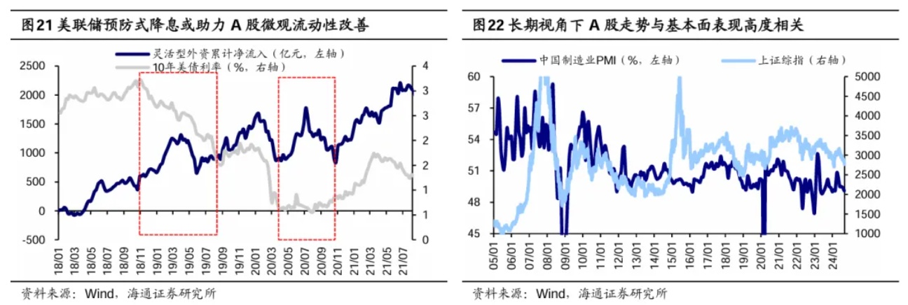 从流动性看,美联储降息或在中短期改善A股宏微观流动性,助力A股上行。一方面前文提到近两年中美央行货币政策周期出现一定错位,未来美联储降息或有望逐步弥合这种政策错位,随着中美利差和人民币汇率压力缓解,国内货币政策空间或逐步打开, 助力A股宏观流动性修复;另一方面,我们在《若海外流动性宽松,A股外资能否回流?-20240901》中指出,海外流动性宽松对A股外资或有短期影响,未来海外流动性改善可能致使灵活型外资在短期回流,推动A股微观流动性改善。