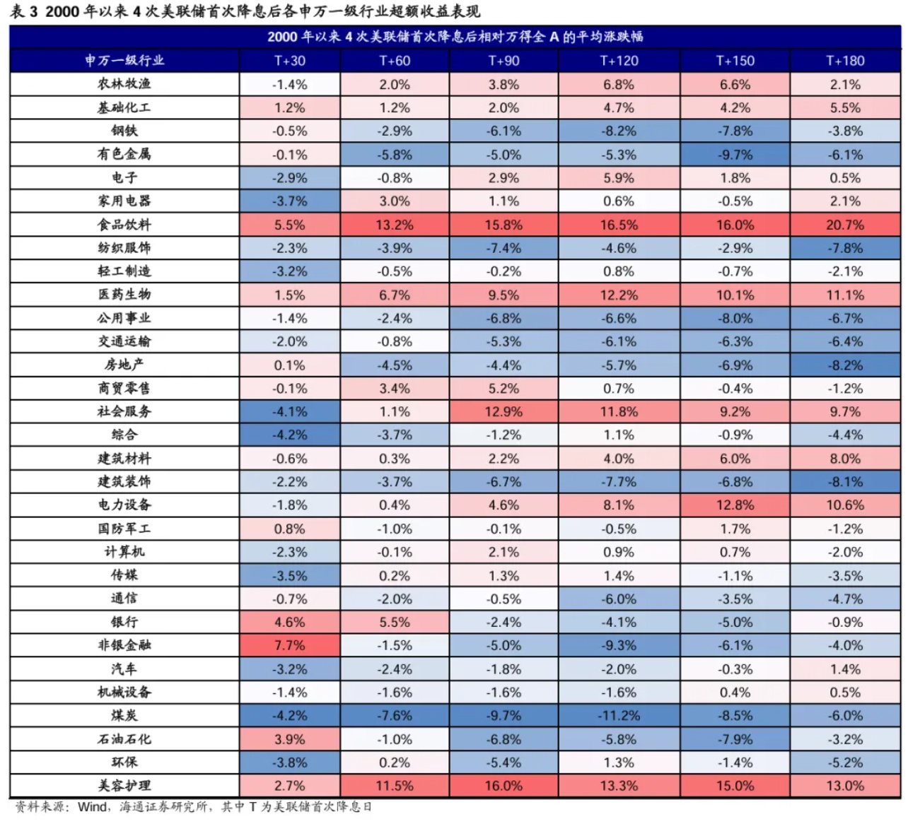 行业:美联储降息短期利好A股金融、食饮等消费行业,中期科技逐步占优。进一步观察2000年以来4次美联储降息后30、60、90、120、150、180天内各申万一级行业相对万得全A的平均涨跌幅,得到如下结论:①短期维度,直接受益于宏观流动性改善的金融行业率先跑赢,同时外资偏好的食饮、美护等消费行业涨幅始终靠前。美联储首次降息落地1个月内,非银、银行的表现最强,外资偏好的食品饮料、美容护理涨跌幅也逐步占优,此外石油、化工等部分资源品行业表现也相对较强;而在降息落地1-3个月内,食品饮料、美容护理的表现愈发强劲,医药行业也逐渐跑赢。②中期维度,社服、电力设备行业逐渐跑赢,利率敏感的电子、计算机等科技行业逐步占优。美联储首次降息落地3-6个月内,社会服务行业的涨幅较为显著,电力设备行业的表现渐强。此外,电子、计算机等科技行业的超额收益有所改善,但由于受多种因素的影响,科技行业在历次降息后的表现差异较大,例如2019年在自主可控与5G催化的加持下电子涨幅明显,而2001年科网泡沫破裂导致电子行业股价承压。