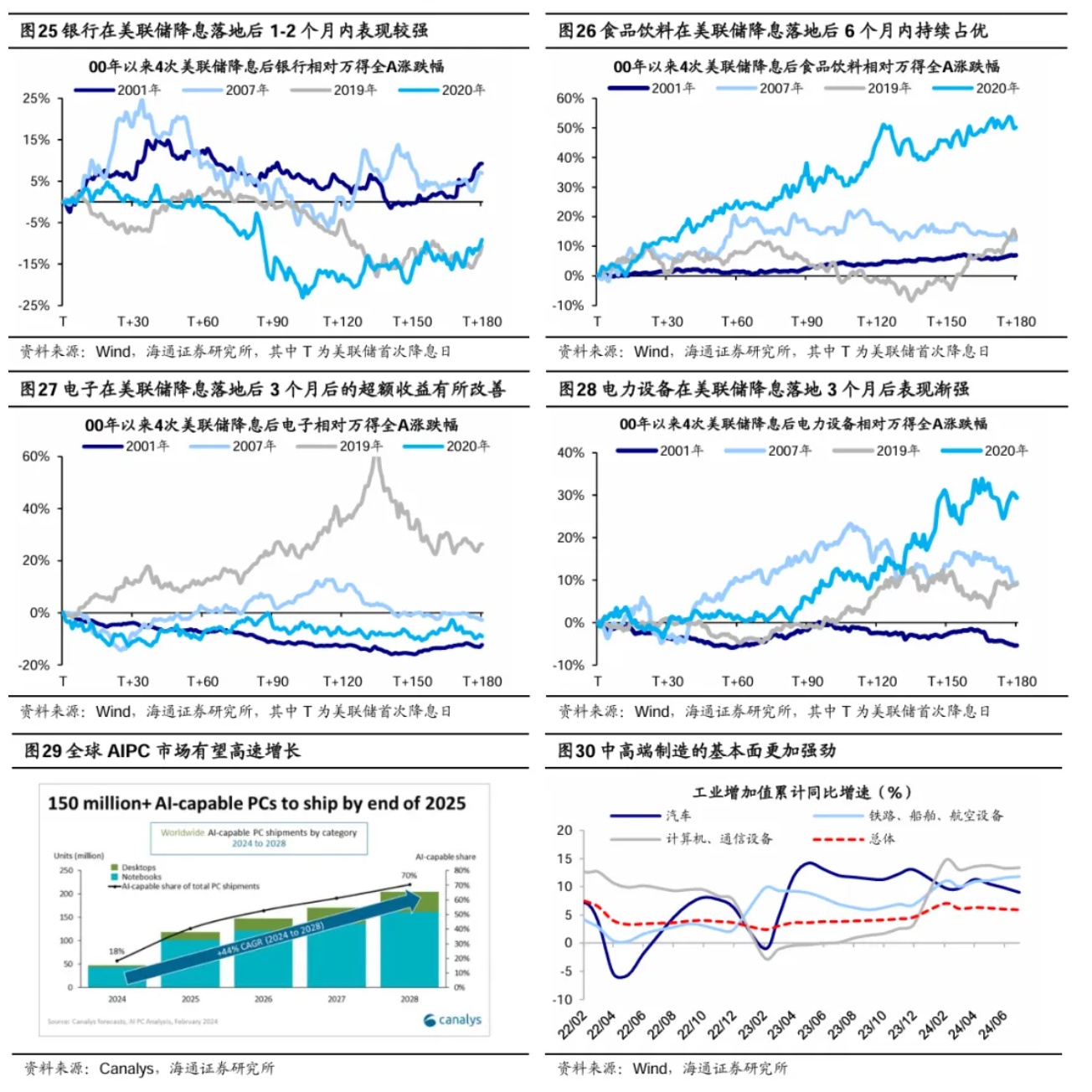 基本面更优的中国优势制造有望成为A股中期主线。借鉴历史,我们认为本轮美联储预防式降息短期内利好金融行业,同时食饮、美护等受到外资偏好的消费行业也有望跑赢;但从中期维度看,电子等科技行业可能逐渐占优。二十届三中全会指出,“要健全因地制宜发展新质生产力体制机制”,中期维度看,围绕高水平科技自立自强,中国优势制造有望成为引领新质生产力发展的重要板块,因此相关板块业绩确定性或更强,具体关注具备出口竞争优势的中高端制造和引领新质生产力发展的科技制造。