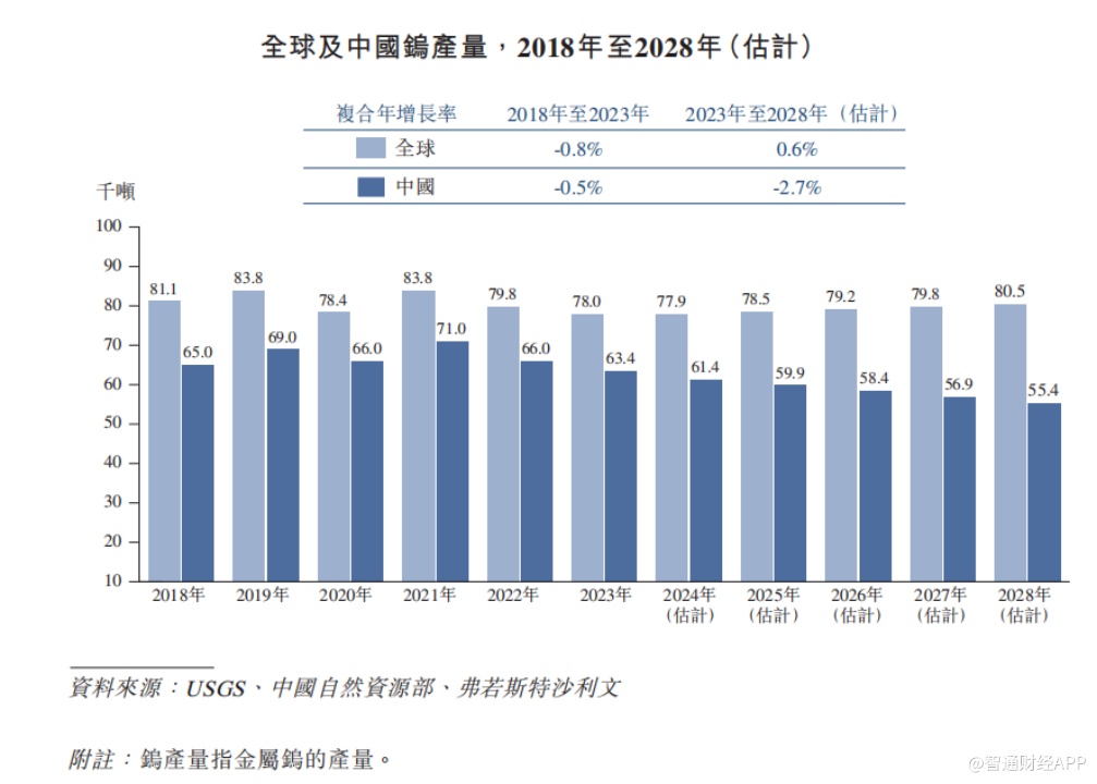 据弗若斯特沙利文报告,全球钨储量由2018年的约330万吨增加至2023年的440万吨,复合年增长率为5.9%。2023年,全球钨产量7.8万吨,全球钨耗用量约12.41万吨,缺口高达4.61万吨,体现了钨资源的稀缺和强劲需求。展望未来,随着快速增长下游市场钨用量不断增加,如光伏(PV)行业亦耗用大量的钨,预期钨耗用量于2028年达15.11万吨,复合年增长率为4%。