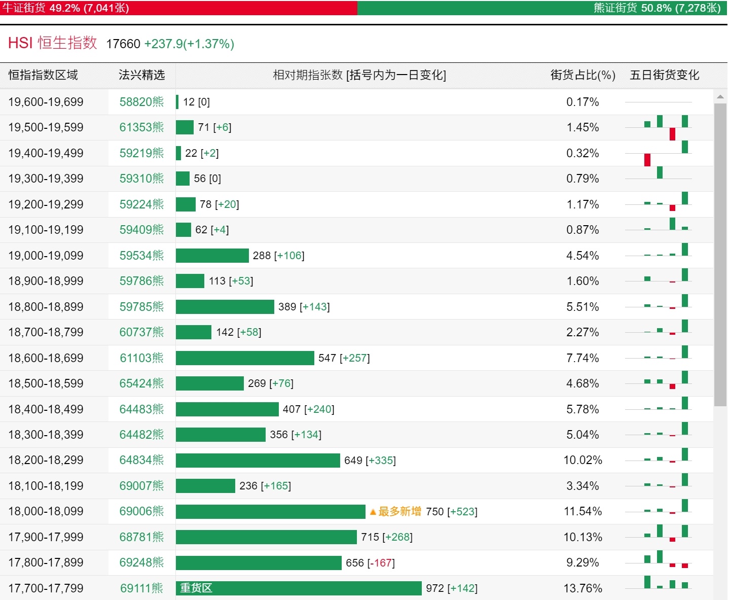法兴恒指牛熊证街货分布图中的数据显示,熊证街货重货区在17700-17799区间,该区间最新熊证数量为972张,较上一交易日增加142张;最多新增在18000-18099区间,该区间最新熊证数量为750张,较上一交易日增加523张。
