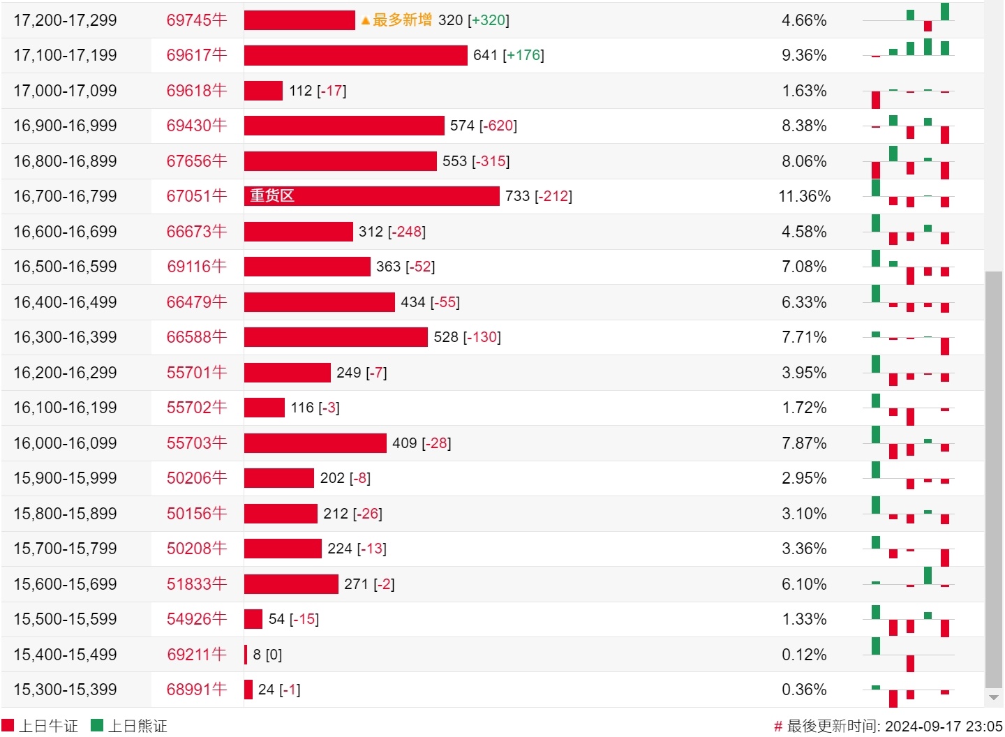 牛证街货重货区在16700-16799区间,该区间最新牛证数量为733张,较上一交易日减少212张;最多新增在17200-17299区间,该区间最新牛证数量为320张,较上一交易日增加320张。