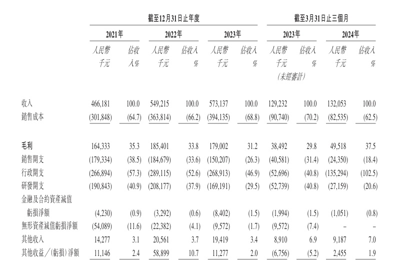 财务方面,截至2021年、2022年、2023年及2024年截至3月31日止三个月,公司实现收入分别约为4.66亿元、5.49亿元、5.73亿元及1.32亿元人民币。同期,年内亏损分别约为4.80亿元、4.23亿元、3.56亿元及1.18亿元人民币。