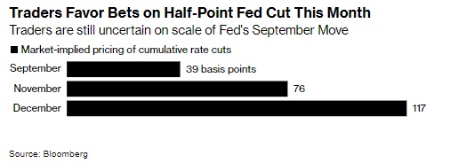 尽管如此,交易员们对于美联储9月份的加息幅度仍然没有达成共识。几个月来,金融市场一直在争论美联储四年来的首次降息幅度,而经济报告和美联储官员的讲话更是加剧了这种争论。交易员们已经完全消化了四分之一个百分点的降息预期,但随着对美联储决定的猜测越来越多,最近几天,他们开始押注美联储将采取更大幅度的降息,即50个基点。