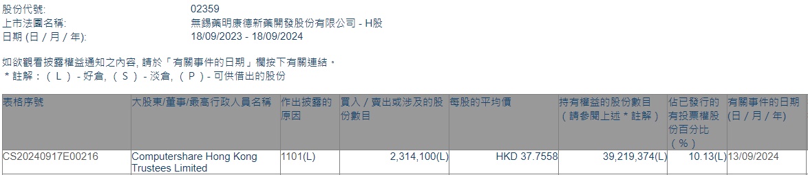 智通财经APP获悉,香港联交所最新资料显示,9月13日,Computershare Hong Kong Trustees Limited增持药明康德(02359)231.41万股,平均每股作价为37.7558港元,总金额约为8737.07万港元。增持后最新持股数目约为3921.94万股,最新持股比例为10.13%。