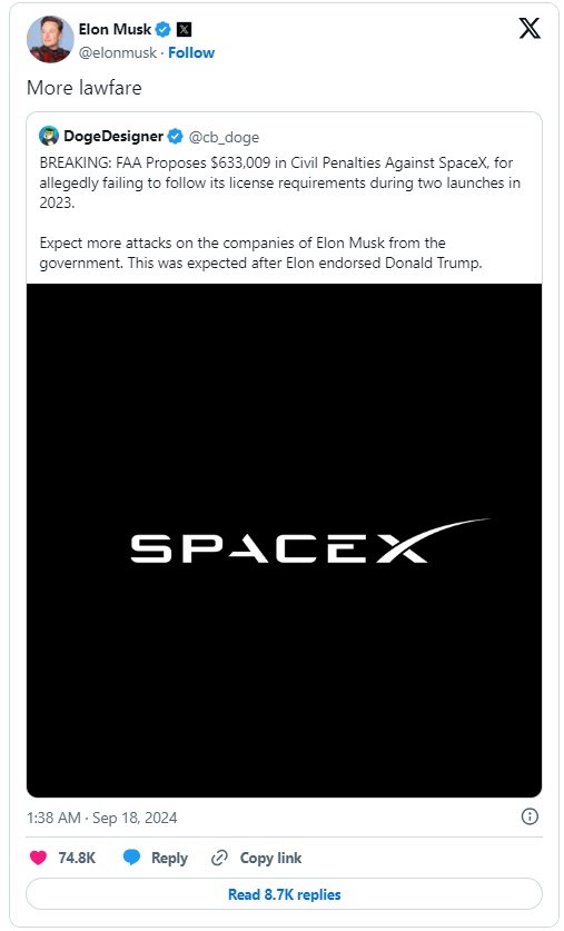 马斯克在社交媒体平台X上发文,对FAA的民事处罚表示不满,将其描述为一场“法律战”。