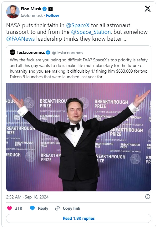 他在帖子中质疑FAA的决策,指出NASA信任SpaceX负责所有宇航员往返国际空间站的运输任务,而FAA领导层却似乎认为自己更了解情况。马斯克还表示,他相信即将揭露的证据将显示FAA的行为是不当的、出于政治动机的。