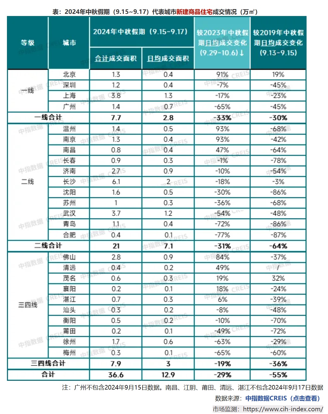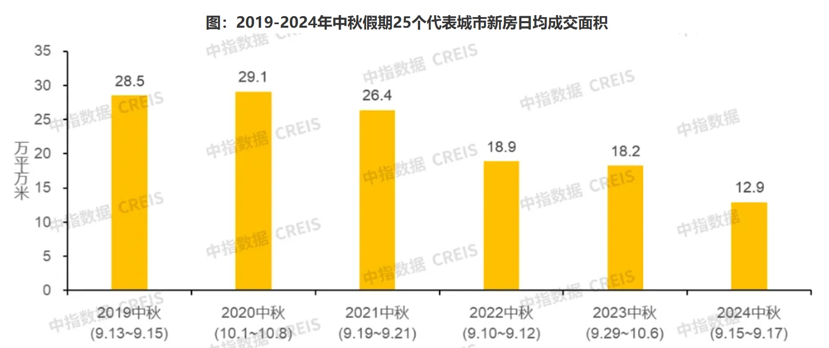 从新房市场表现来看,中秋假期期间,房企积极去化现有库存,部分地方政府亦推出相关支持政策,以提升楼市活跃度。但受“台风”、“出游”等多重因素影响,多数城市售楼处整体到访量一般,成交量低于以往中秋假期水平,根据中指数据,今年中秋假期期间(9.15~9.17)25个代表城市新房日均销售面积较2023年假期下降约29%(注:由于2023年中秋和国庆假期连休,与去年对比时选择连休假期日均成交做对比)。