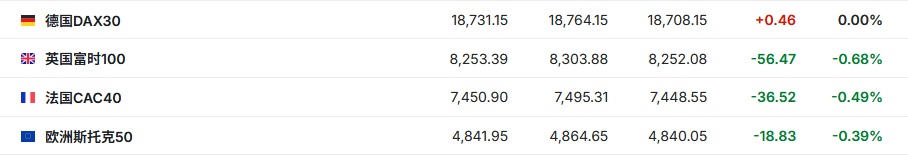 2. 截至发稿,德国DAX指数涨0.00%,英国富时100指数跌0.68%,法国CAC40指数跌0.49%,欧洲斯托克50指数跌0.39%。