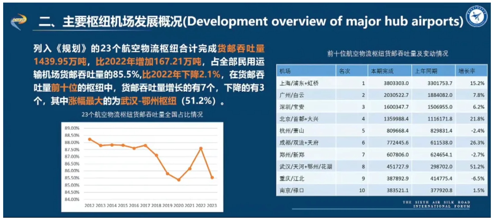 《指数》显示,2023年我国民用运输机场完成货邮吞吐量1683.3万吨,比上年增长15.8%,恢复到2019年的98.4%。本次评价首次将鄂州机场纳入研究,将武汉-鄂州作为一个航空物流枢纽。列入国家规划的23个航空物流枢纽27个机场合计完成货邮吞吐量1439.95万吨,比2022年增加167.21万吨,占全部民用运输机场货邮吞吐量的85.5%,比2022年下降2.1%。23个枢纽中有19个实现增长,4个出现下跌。货邮吞吐量前十位的枢纽中,武汉-鄂州枢纽涨幅最大,达到51.2%。