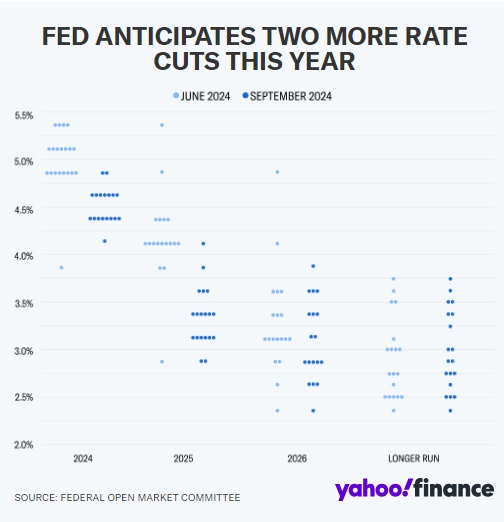 美联储官员还表示,他们预计在11月和12月的会议上将再次下调基准利率50个基点。到2025年,预计将有四次降息,2026年则计划两次降息。