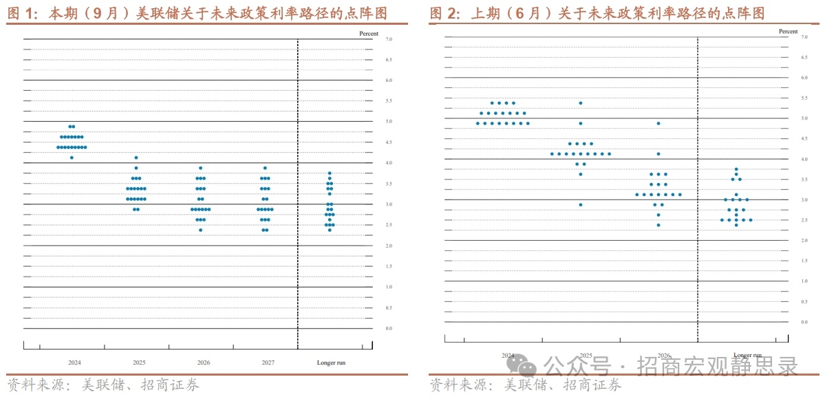 美联储降息50BP、缩表节奏不变,下调2024-2025年核心通胀预测,上调2024-2026年失业率预期,点阵图预计今明两年各降息100BP。本期经济预期的主要变化为:1)2024、2025年和2026年实际GDP增速预期中值均为2.0%(6月预期分别为2.1%、2.0%和2.0%);2)2024、2025年和2026年核心PCE增速预期中值分别为2.6%、2.2%和2.0%(6月预期分别为2.8%、2.3%和2.0%);3)2024、2025年和2026年失业率预期中值分别4.4%、4.4%和4.3%(6月预期分别为4.0%、4.2%和4.1%);4)2024、2025年和2026年联邦基金利率预期中值分别4.4%、3.4%和2.9%(6月预期分别为5.1%、4.1%和3.1%)。点阵图预计2024年降息100BP、2025年降息100BP(6月预期为2024年降息25BP、2025年降息100BP)。