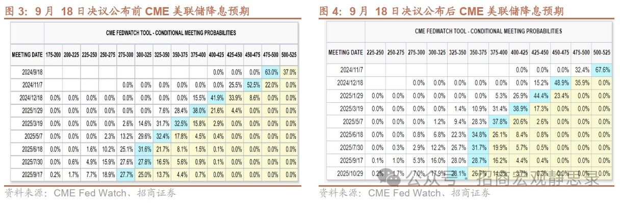 为何是50BP?三点原因。近期美国GDP、零售数据显示经济韧性,且核心通胀有所抬头,似乎并无迫切大幅降息的必要性,但50BP的降息预期迅速升温且靴子落地,为何?表面上看,鲍威尔的打法是“以空间换时间”,用更多的降息幅度保护风险更高的就业,进而维持更久的经济韧性。但更重要的原因有三点:第一,鲍威尔表态说明,疫情对美国通胀以及劳动力市场紧张程度的影响已经结束,进而货币政策可以“正常化”、转向“中性立场”;第二,金融危机后美联储常用前瞻指引作为与市场重要的沟通工具减少预期差、降低波动,但去年以来前瞻指引逐步失效甚至消失,今年转向“数据依赖”、不预设路径。由于目前以美国股债为代表的美国资产与降息预期已演绎至极致状态,过多降息会导致日元套息交易反转,过少降息又会使已Price-in更多降息的资产大幅波动,因此相比前瞻指引,坚持数据依赖、不引导预期反而是更风险中性的选择;第三,本轮美联储降息动作明显滞后其他央行,6月以来欧央行已大幅降息,美联储跟随式降息也有利于以美元为代表的美国资产与非美国家保持相对平衡。