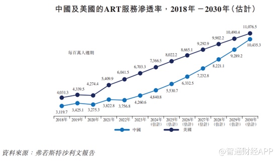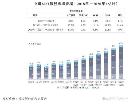中国ART服务市场规模也在逐年增长,由2018年的252亿元人民币(单位,下同)增至2023年的308亿元,复合年增长率为4.1%。随着对ART服务需求的持续增长,中国ART服务市场将继续快速增长,并预计于2027年及2030年将达474亿元及630亿元,复合年增长率分别为11.4%及9.9%。