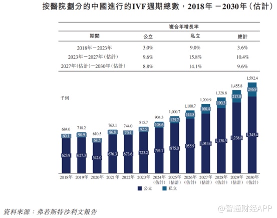 近些年,ART服务渗透率持续增长。中国进行的IVF周期总数已由2018年的68.4万例增至2023年的81.57万例,复合年增长率为3.6%。由于对ART服务的需求不断增长且人们负担能力日益提高,预计IVF周期总数将于2027年及2030年达120.99万例及159.24万例,复合年增长率分别为10.4%及9.6%。