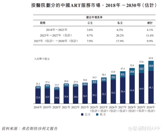 按市场规模来看,公立医疗机构所提供的ART服务的市场规模由2018年的220亿元增至2023年的265亿元,复合年增长率为3.8%,并预计将进一步增至2027年及2030年的384亿元及481亿元,复合年增长率分别为9.7%及7.9%。私立医疗机构所提供的ART服务的市场规模由2018年的32亿元增至2023年的44亿元,复合年增长率为6.5%,预计将进一步增至2027年及2030年的91亿元及149亿元,复合年增长率分别为20.2%及17.9%。