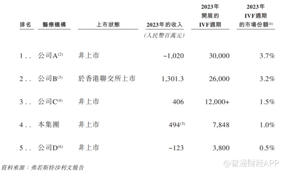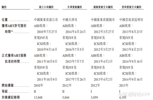 据智通财经APP了解,爱维艾夫成立于2006年,是一家一站式辅助生殖技术(ART)及辅助服务提供商,通过4家特许医院,即广东省湛江久和医院、天津市天津爱维医院、广东省揭阳爱维艾夫医院及云南省昆明爱维艾夫医院,专注为不孕不育患者提供ART及辅助服务,吸引中国15个省和直辖市的患者。截至2024年6月30日,爱维艾夫已治疗10万多名患者,进行65000多个IVF周期,完成78000多次胚胎移植(包括鲜胚移植及冻胚移植),诞生36000多名试管婴儿。根据弗若斯特沙利文的资料,2023年,爱维艾夫的医院在中国民营ART服务提供商中排名第四,占同年在中国进行的IVF周期总数的约1.0%。