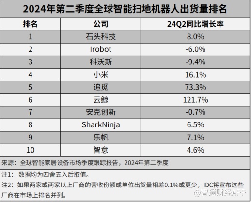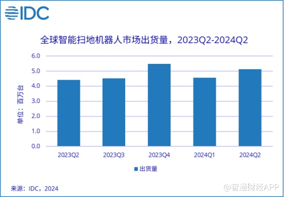 近日,第三方市场咨询机构IDC发布《全球智能家居设备市场季度跟踪报告,2024年第二季度》。报告显示,二季度全球智能扫地机器人出货511.7万台,同比增长15.7%。其中,石头科技(688169.SH)本季度出货量全球第一,这也是中国厂商首次在智能扫地机器人市场登顶。