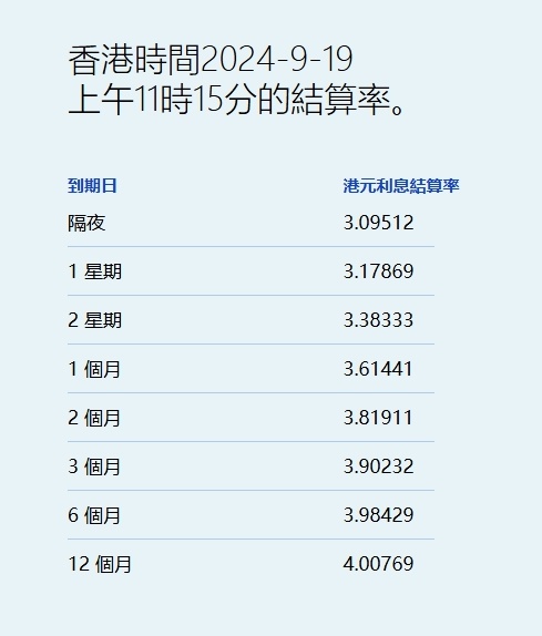 智通财经APP获悉,美联储减息0.5%,在联系汇率制下,香港金管局今日亦将贴现窗基本利率下调50基点。港元拆息今见短息升、中长息落。其中,隔夜息急涨41基点,升穿3%,报3.09512%,逾一周新高,但与楼按相关的一个月拆息则连跌六天,报3.61441%,为去年5月3日以来最低,一周拆息升17基点至3.17869%。