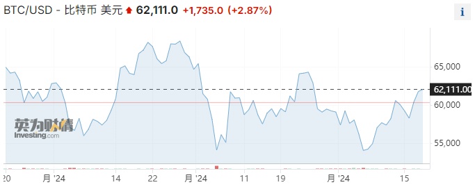 智通财经APP注意到,由于美联储大幅降息对市场产生连锁反应,比特币随美国股指期货上涨触及三周新高。截至发稿,比特币涨2.87%,报62111.0美元。