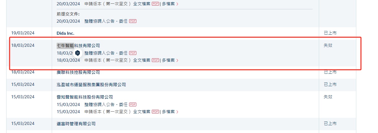 智通财经APP获悉,七牛智能科技有限公司(简称:七牛智能)于2024年3月18日二次递交的港股招股书满6个月,于9月18日失效,递表时申万宏源香港、交银国际、华泰国际为其联席保荐人。2023年6月29日,七牛智能首次向港交所递交招股书。