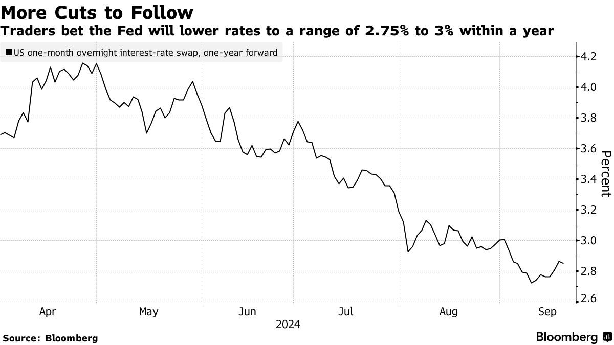 尽管美联储主席鲍威尔将周三降息50个基点的决议描述为对政策的“重新调整”,但市场对今年及以后进一步宽松的速度和幅度的押注几乎没有变化。货币市场倾向于认为,美联储在年底前还将进行三次各25个基点的降息,预计明年还将降息200个基点。这样的预期比美联储最新公布的点阵图所显示的利率路径要更激进,点阵图只显示今年还会再降息50个基点。