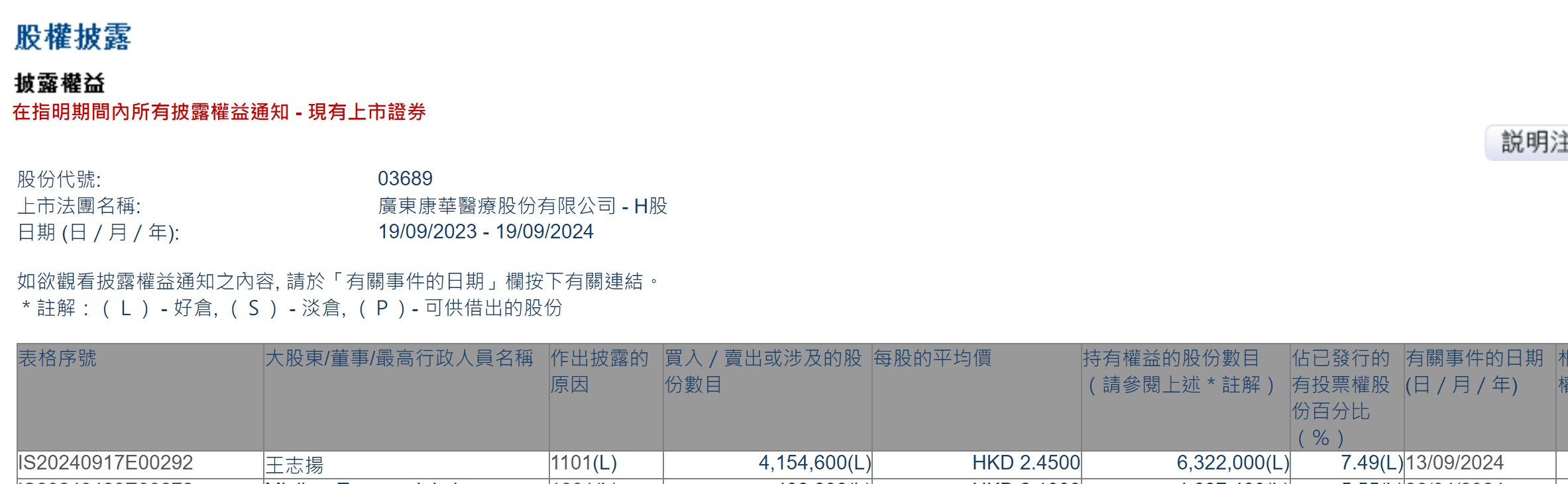 智通财经APP获悉,香港联交所最新资料显示,9月13日,王志扬增持康华医疗(03689)415.46万股,平均每股作价为2.45港元,总金额为1017.877万港元。增持后最新持股数目约为632.2万股,最新持股比例为7.49%。