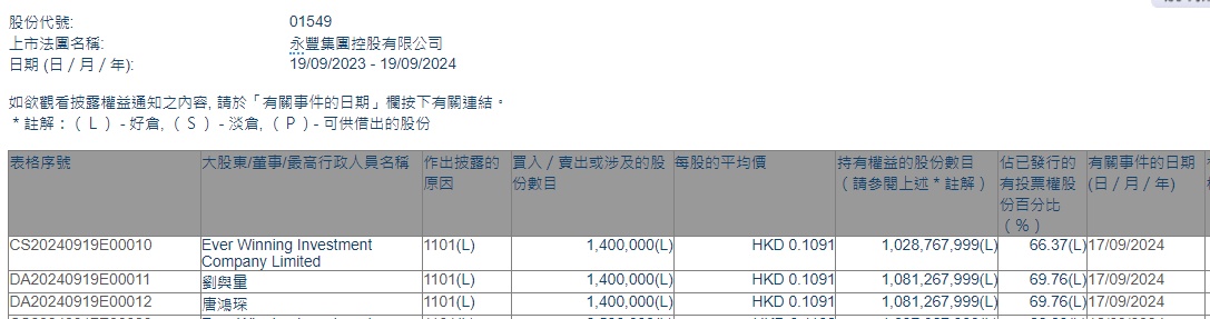 智通财经APP获悉,香港联交所最新资料显示,9月17日,Ever Winning Investment Company Limited增持永丰集团控股(01549)140万股,每股作价0.1091港元,总金额约为15.27万港元。增持后最新持股数目约为10.29亿股,最新持股比例为66.37%。